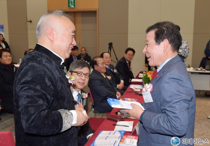 윤장현 광주광역시장이 9일 오후 서구 김대중컨벤션센터 201호에서 열린 '일대일로와 아시아문명교류 국제학술토론회'에 참석해 일대일로 기획자로 널리 알려진 중국 칭화대 리시광 교수(국제미디어센터 주임)와 반갑게 인사를 나누고 있다.