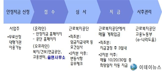 지원금 신청은 일자리 안정자금 홈페이지(www.jobfunds.or.kr)를 통한 온라인 신청과 3대 사회보험공단(근로복지공단, 건강보험공단, 국민연금공단) 지사나 고용노동부 보령고용센터, 읍면사무소(행정복지센터)에서 오프라인(방문, 우편, 팩스)으로도 신청이 가능하다. 문의전화는 근로복지공단 1555-0075, 고용노동부 고용센터 국번없이 1350, 각 읍․면사무소로 문의하면 된다.