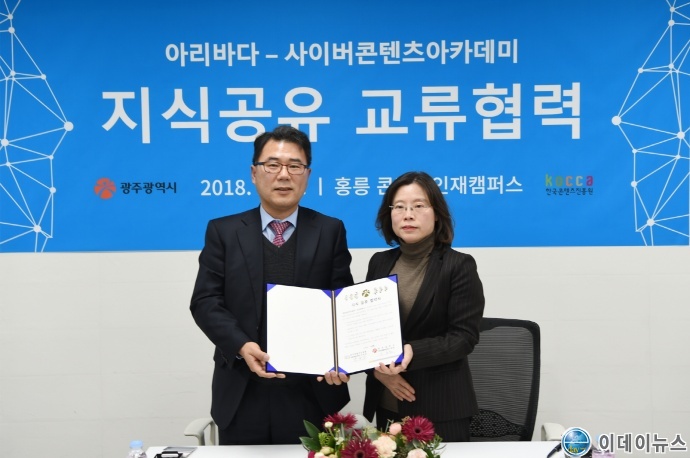 광주시 지역공동체추진단은 24일 한국콘텐츠진흥원 콘텐츠인재캠퍼스에서 구종천 시 지역공동체추진단장과 박경자 진흥원 교육사업본부장, 관계 공무원, 직원 등이 참석한 가운데 ‘한국콘텐츠아카데미와 빛고을열린강연방 아리바다 지식공유 교류협력을 위한 협약’을 체결했다.