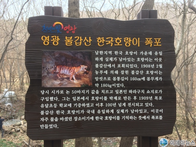 불갑산은 대한민국에서 유일하게 실체가 남아있는 한국산 호랑이가 잡혔던 곳으로‘호랑이 폭포’는 호랑이가 자주 물을 마셨던 곳으로 전해지는 장소에 설치되었다. 앞서 2009년에 청동으로 제작되어 불갑산에 전시된 호랑이상 2점은 만발한 상사화를 배경으로 관광객들이 사진을 찍는 명소로 자리 잡았는데 이번에 설치된 호랑이상 역시 영광군의 새로운 명물과 산 교육장으로 자리매김 할 것으로 기대된다.