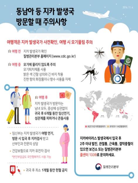 질병관리본부는 해외여행을 계획하고 있는 경우 여행 전 질병관리본부 홈페이지 및 모바일 홈페이지를 통해 지카바이러스 감염증 발생국가 현황을 확인할 것을 당부했다.