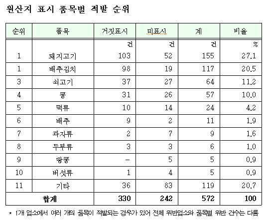 원산지를 위반한 품목 중에서는 돼지고기와 쇠고기가 219건으로 38.3%를 차지해 가장 많이 적발됐으며, 이어서 배추김치 117건(20.5%), 콩 57건(10.0%), 떡류 24건(4.2%)순으로 나타났다.