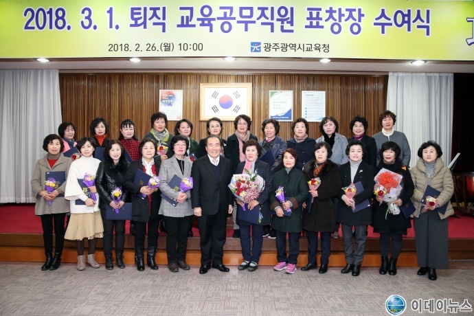 광주광역시교육청(교육감 장휘국)이 26일 오전 10시 시교육청 대회의실에서 퇴직 교육공무직원과 동료 교직원 등 300여 명이 참석한 가운데 2018년 3월1일자 퇴직 교육공무직원에 대한 교육감 표창장 수여식을 개최했다.