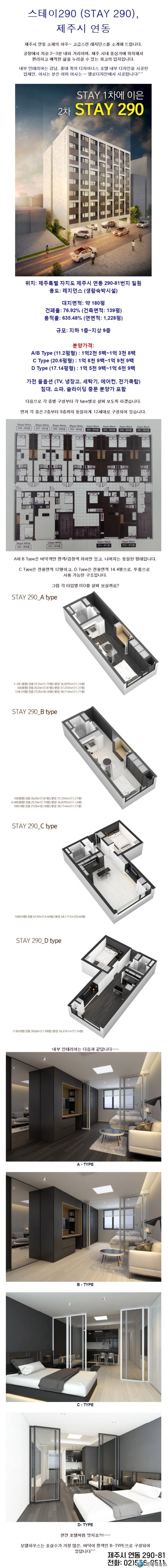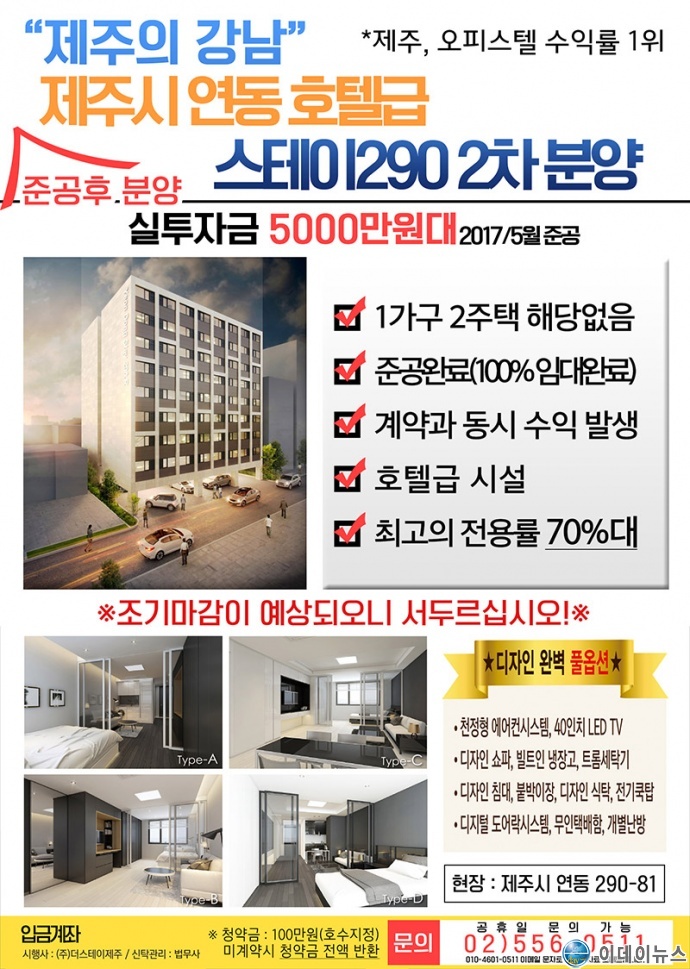 제주공항에서 2~#분 거리의 시내 중심가 연동에 전체 세대에 풀옵션의 홍보를 하며 한편으로는 편리하고 쾌적한 환경을 내세우면서 스테이 290의 고급 오피스텔 분양을 시작했다.