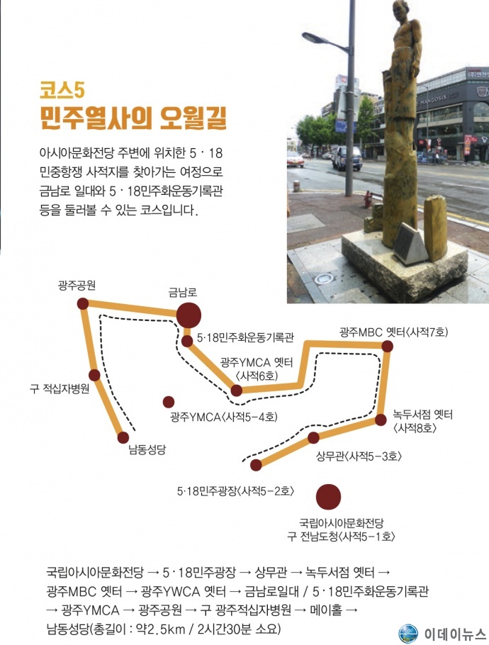 ▲1코스는 문학을 테마로 한 ‘김현승의 플라타너스길’ ▲2코스는 예술을 테마로 한 ‘허백련의 예술유람길’ ▲3코스는 음악을 테마로 한 ‘정율성의 음악산책길’ ▲4코스는 대중문화를 테마로 한 ‘K-Pop 아이돌 골목길’ ▲5코스는 인권을 테마로 한 ‘민주열사의 오월길’이다.