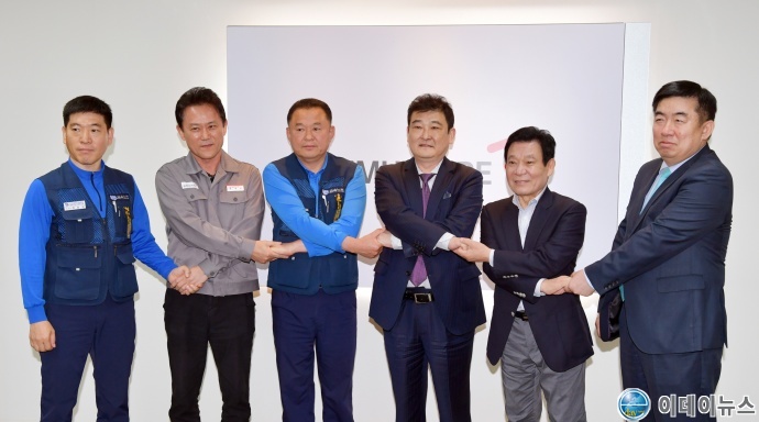 오른쪽부터 조재석 금호타이어 부사장, 윤장현 광주시장, 더블스타 차이융선 회장, 조삼수 금호타이어 노조 대표지회장, 전대진 금호타이어 부사장, 정송강 금호타이어 노조 곡성지회장.