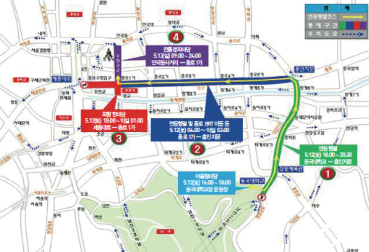 특히 오는 12일 종로 1가 사거리에서 흥인지문 구간은 오전 6시부터 다음 날 오전 3시까지, 세종대로 사거리에서 종로1가 사거리 구간은 오후 6시부터 다음 날 오전 1시까지, 안국사거리에서 종로1가 사거리 구간은 오후 6시부터 다음 날 오전 1시까지, 동국대에서 흥인지문 구간은 오후 6시부터 8시 30분까지 전면 통제된다.