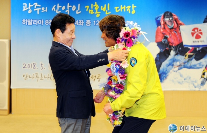 세계 제10위의 고봉 안나푸르나(8,091m) 등정에 성공한 김홍빈 대장을 축하하는 환영식이 25일 오후 4시30분 광주광역시청 3층 비즈니스룸에서 열렸다.