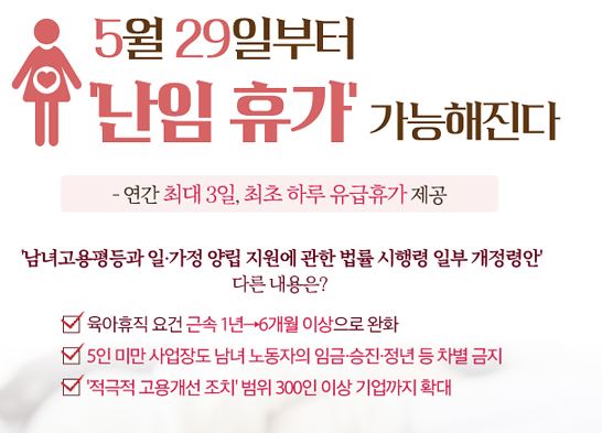 1일 유관 업계에 따르면 「남녀고용평등과 일ㆍ가정 양립 지원에 관한 법률 시행령」 일부 개정안이 시행되면서 난임 치료 휴가는 연간 최대 3일간 쓸수 있으며 최초 1일은 유급이 적용된다. 난임 치료 휴가를 받으려면 근로자는 휴가 시작 3일 전까지 사업주에게 신청하면 된다.