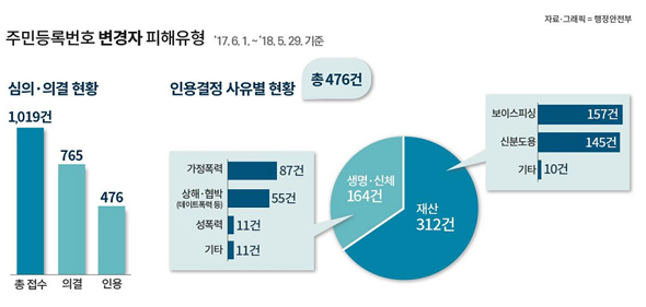 1일 주민등록번호변경위원회에 따르면 위원회는 지난해 6월 1일 출범 이후 지난달(5월) 29일까지 1019건의 주민번호 변경 신청을 처리했다. 이 중 765건에 대해 신청인이 제출한 입증자료와 사실조사에 근거해 심의한 결과 476명의 번호가 변경됐다.