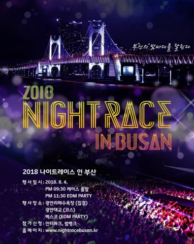 한편 나이트 레이스 행사는 부산의 대표 여름 축제인 `부산바다축제` 프로그램의 일환으로 부산 여름축제를 상징해 전국적 관광콘텐츠로 자리매김하고 있다. 자세한 사항은 2018 나이트 레이스 인 부산 홈페이지, 페이스북 혹은 운영사무국으로 문의하면 된다.