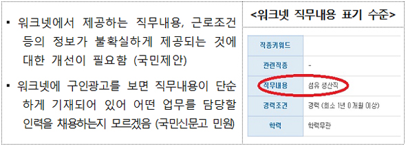 그러나 워크넷의 구인광고가 직무내용을 상세하게 제공하지 않아 구직자들이 자신의 전공이나 기술 분야에 적합하지 않은 기업에 지원해 시간과 비용이 낭비됐다는 민원이 생겼다.