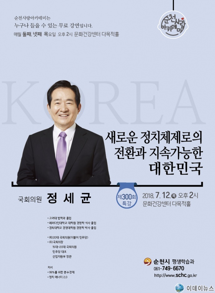 지난 2003년 3월에 첫 강연을 시작으로 이번 300회를 맞이하는 순천사랑아카데미는 7월 12일(목) 오후 2시에 ‘정세균 (전)국회의장’을 초빙해 ‘새로운 정치체제로의 전환과 지속가능한 대한민국’이라는 주제로 순천시민들과 함께하는 시간을 마련했다.