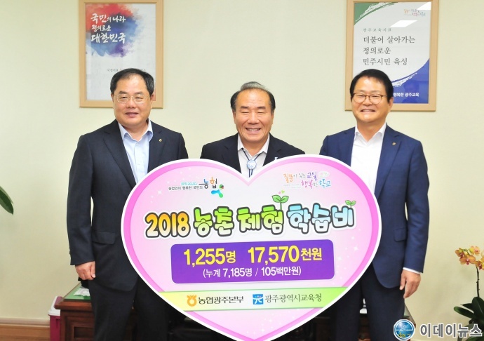 ‘2018학년도 농촌체험학습 지원금 전달식’은 18일 시교육청 2층 교육감실에서 진행됐다. 이날 농협 광주본부는 올해 지원금 1757만원을 시교육청에 전달했다. 전달식엔 장휘국 광주시교육감과 김일수 농협중앙회 광주지역본부장 등이 참석했다.