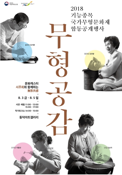 19일 문화재청 국립무형유산원(원장 조현중)과 한국문화재재단(이사장 진옥섭)이 지원하는 2018 기능 종목 국가무형문화재 합동공개행사–문화캐스터 서주희와 함께하는 `무형공감 無形共感`이 오는 8월 3일부터 5일까지 동덕아트갤러리(서울특별시 종로구 인사동)에서 개최된다다고 밝혔다.