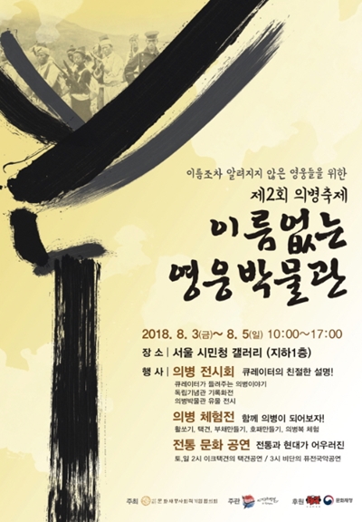 먼저 `이름 없는 영웅박물관` 전시는 오는 3~5일 10시부터 17시까지 서울 시민청 갤러리에서 운영된다. 금산 칠백의총(사적 제105호), 의병승장비(충청남도 문화재자료 제23호) 등 의병 사적지 사진 전시와 곽재우 유물 일괄(보물 제671호) 중 장검(長劍)ㆍ마구(馬具) 등 유물 3점(복제)과 의병활동 사진 등을 전시한다. 전시 기간 중 의병체험 공간 운영과 함께 문화재형(예비)사회적기업이 참여하는 택견공연과 퓨전국악공연 등의 문화행사도 진행된다.