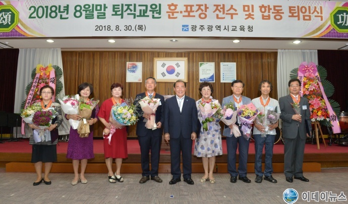 광주광역시교육청(교육감 장휘국)이 30일 오전10시 대회의실에서 퇴임교원과 동료교원, 가족 친지 등 200여 명이 참석한 가운데 ‘2018년도 8월말 퇴직교원 훈‧포장 전수 및 합동 퇴임식’을 개최했다.