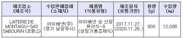 지난 4일 식품의약품안전처(처장 류영진)는 수입식품판매업체인 아이배냇(주)(경기 남양주시 소재)가 수입ㆍ판매한 프랑스산 `아이배냇 순 산양유아식-4(식품유형: 성장기용조제식)` 제품에서 식중독균인 클로스트리디움 퍼프린제스가 검출돼 해당 제품을 판매중단 및 회수 조치한다고 밝혔다. 회수 대상은 유통기한이 2020년 11월 26일인 제품이다.