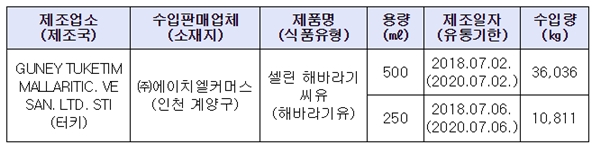 지난 21일 식품의약품안전처(처장 류영진ㆍ이하 식약처)는 수입식품판매업체인 에이치엘커머스(인천 계양구 소재)가 수입ㆍ판매한 터키산 `셀린 해바라기씨유(SELIN SUNFLOWER SEED OIL)`(식품유형: 해바라기유) 제품에서 벤조피렌이 기준(2.0 ㎍/kg 이하) 초과(3.1 ㎍/kg, 3.6 ㎍/kg) 검출되어 해당 제품을 판매중단 및 회수 조치한다고 밝혔다. 회수 대상은 유통기한이 2020년 7월 2일, 2020년 7월 6일인 제품이다.