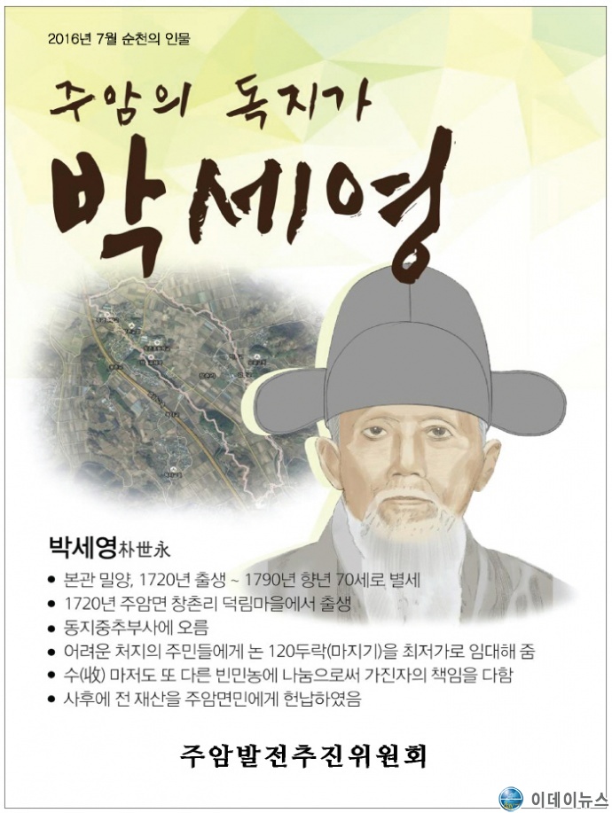 순천인물 주암면의 옛 독지가 박세영(朴世永)선생은 지금으로부터 298여년 전인 서기 1720년 (조선 제19대 숙종46년)에 전남 순천시 주암면 창촌리 덕림마을의 밀양박씨(密陽朴氏) 양반(兩班) 지주가문(地主家門)에서 태어나셨으며 서기 1790년(조선 제22대 정조14년) 향년 70세의 나이로 별세 하시었다.