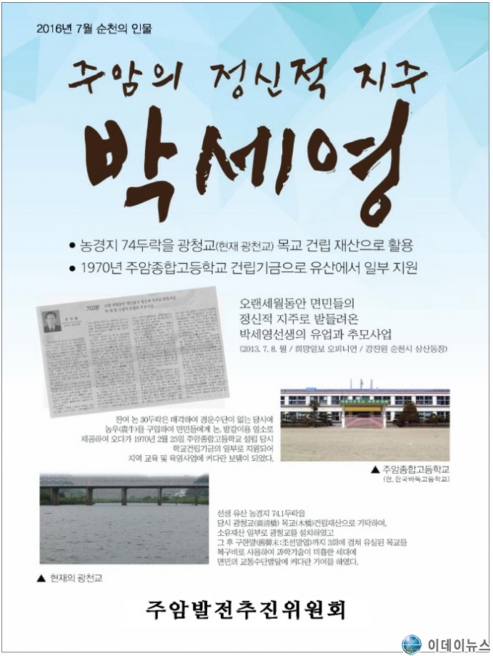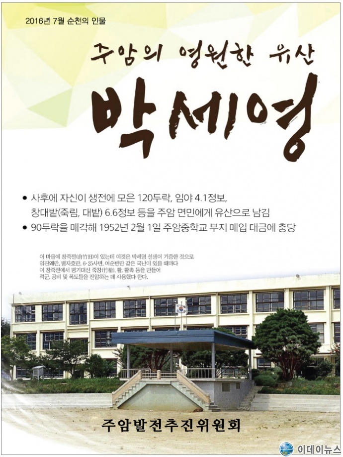 순천시, 『행복순천시민운동추진위원회(공동위원장 김길환, 최두례)』는 『2016년 7월의 순천인물』로 『주암의 독지가 박세영(朴世永) 선생』을 선정 발표하고, 그 후 각급 기관·학교·사회단체의 각종 기념식과 행사장을 순회하며 시민과 학생 들에게 생전의 공적을 추모전시 및 홍보활동 전개하여 오고 있었다.