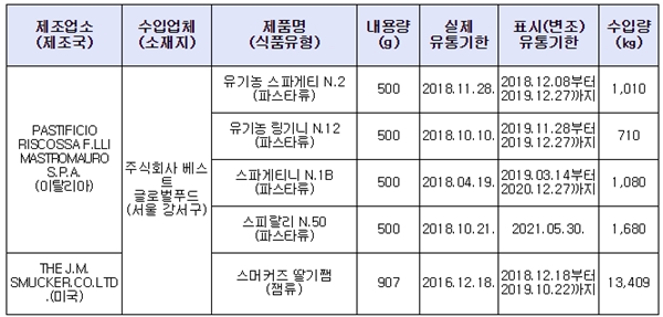 회수 대상은 수입업체가 `주식회사 베스트글로벌푸드`로 표시된 `유기농 스파게티 N.2(유통기한 2018년 12월 8일~2019년 12월 27일)`, `유기농 링기니 N.12(2019년 11월 28일~2019년 12월 27일)`, `스파게티니 N.1B(2019년 3월 14일~2020년 12월 27일)`, `스피랄리 N.50(2021년 5월 30일)`, `스머커즈 딸기쨈`(2018년 12월 18일~2019년 10월 22일) 제품이다.