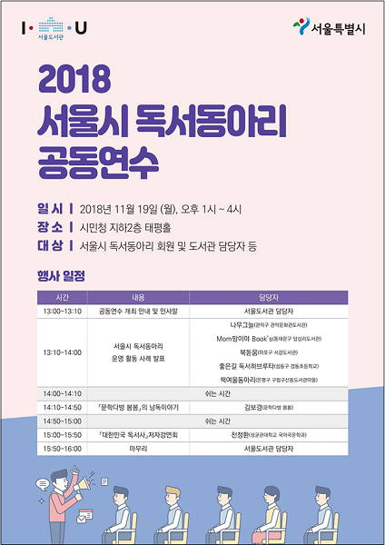 [아유경제=정진영 기자] 서울도서관은 오는 19일 서울시민청 태평홀에서 `2018 서울시 독서동아리 공동연수`를 개최한다고 밝혔다.