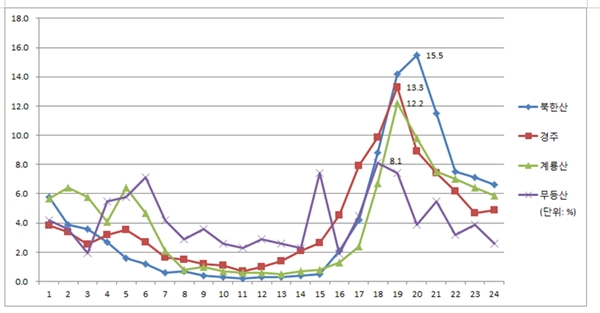 26일 환경부 산하 국립공원관리공단(이사장 권경업)은 북한산, 경주, 계룡산, 무등산 등 도심권 4개 국립공원의 멧돼지의 서식 실태를 2016년부터 최근까지 분석한 결과, 멧돼지 서식 밀도가 여름철에 정점을 찍고 겨울철에는 낮아지는 경향을 확인했다고 밝혔다.