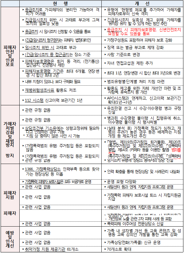 정부는 추진 과제 가운데 법 개정 등이 필요한 사항에 대해서는 관련 법률이 조속히 개정되도록 노력하고 가정폭력 대응 매뉴얼 운영과 피해자 상담ㆍ보호ㆍ자립 지원 등은 즉시 시행한다.