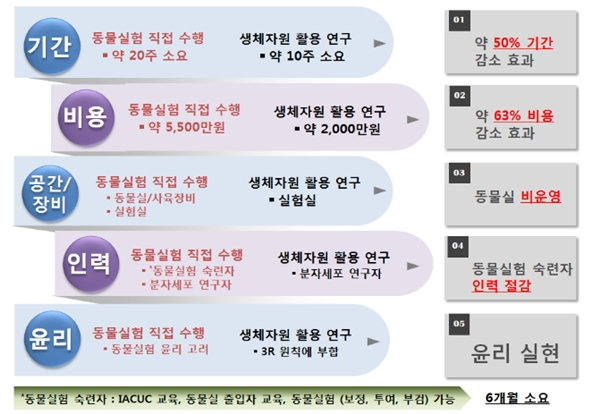 연구자들은 실험동물자원은행을 통해 실험동물 사용 빈도를 줄여 생명존중 가치를 실현할 뿐만 아니라 연구비용과 시간을 획기적으로 감축하여 단기간 내 많은 연구 성과를 기대할 수 있게 됐다.