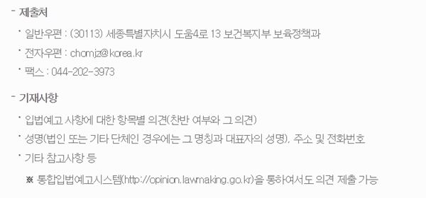 한편 이번 제정안에 대해 의견이 있는 단체 또는 개인은 2019년 1월 19일까지 보건복지부 보육정책과로 의견을 제출하면 된다.