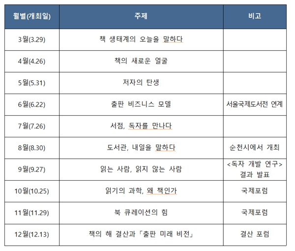 이번 포럼에서는 한 해 동안 다양하게 펼친 책의 해 사업을 되돌아보고 앞으로의 과제를 논의하며, 문체부가 준비하고 있는 `출판미래비전 2030(안)` 연구용역에 대한 공개 토론회를 진행한다. 포럼의 사회는 `2018 책의 해` 유성권 집행위원이 맡는다.