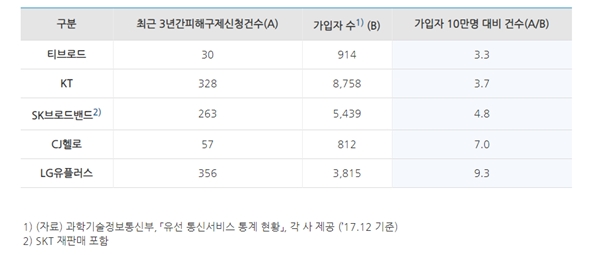 최근 3년간(2015년~2017년) 한국소비자원에 접수된 5개 초고속 인터넷 업체 관련 피해구제 신청건수는 총 1034건으로, 가입자 10만 명 대비 건수는 티브로드가 3.3건으로 가장 적었고, 다음으로 KT 3.7건, SK브로드밴드 4.8건 등의 순이었다.
