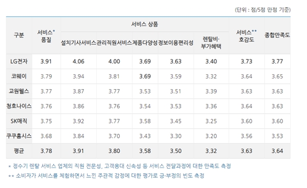 서비스 품질, 서비스 상품, 서비스 호감도 3개 부문을 총체적으로 평가한 종합만족도는 평균 3.64점이었고, LG전자 3.77점, 코웨이 3.65점, 교원웰스·청호나이스 3.63점 등의 순이었다.