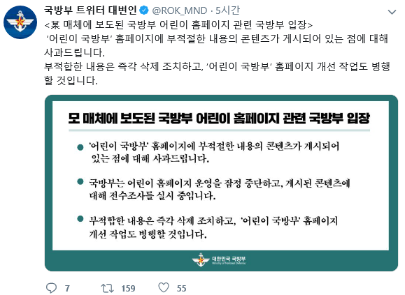 어린이들을 대상으로 하기에는 폭력성을 띈 게시물들이 논란을 일으키자 국방부는 트위터 계정을 통해 "`어린이 국방부` 홈페이지에 부적절한 내용의 콘텐츠가 게시돼 있는 점에 대해 사과드립니다. 부적합한 내용은 즉각 삭제 조치하고, `어린이 국방부` 홈페이지 개선 작업도 병행할 것"이라고 입장을 밝혔다.