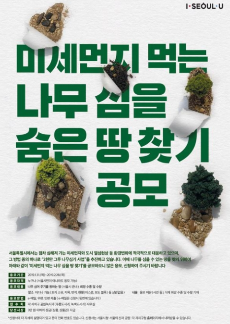 [아유경제=정현호 기자] 서울시는 미세먼지와 도시 열섬현상에 보다 적극적으로 대응하기 위해 시민들이 나무 심을 땅을 찾아내면 그 장소에 원하는 나무를 심어주는 `미세먼지 먹는 나무 심을 땅 찾기 공모`를 시행한다고 7일 밝혔다.