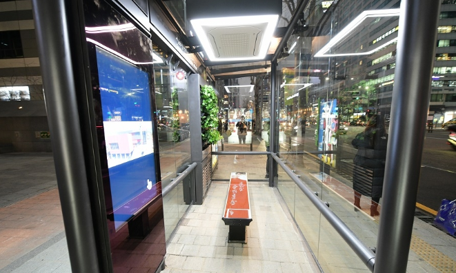 버스정류소 천정과 벽면은 겨울철 칼바람을 막아주는 강화소재 유리벽을 감싸고 그 안에 ▲냉ㆍ온풍기와 에어 커튼 ▲공기정화 식물 ▲서리풀 온돌의자 ▲스마트 터치스크린 등을 갖췄다. 특히 정류소 중앙 천정에 설치된 냉ㆍ낭방기는 연중 내내 오전 6시~9시, 오후 18시~21시에 겨울철 한파와 여름철 폭염에 버스를 기다리는 주민들을 위해 작동한다. 이 냉ㆍ난방기는 미세먼지 저감필터가 장착돼있어 정류소 내부 공기를 청정하게 유지하는 기능도 한다.