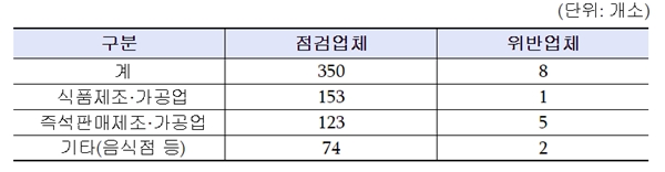 주요 위반 내용은 ▲유통기한 경과 제품 보관(1곳) ▲건강진단 미실시(7곳)다. 적발된 업체는 관할 지자체가 행정처분 등의 조치를 실시하고, 3개월 이내에 다시 점검해 개선 여부를 확인할 예정이다.
