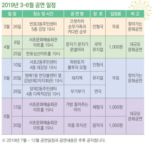 오는 26일 반포3동주민센터에서 인형극 `으랏차차 순무가족의 커다란 순무`를 시작으로 다음 달(4월) 8일에는 서초문화예술회관에서, 오는 25일에는 반포심산아트홀에서 국악뮤지컬 `문지기문지기 문열어라`를 선보인다.