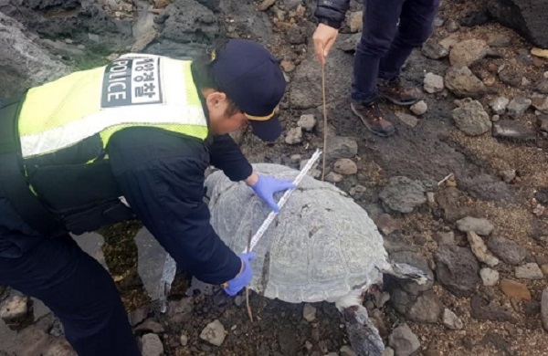 경찰 등에 따르면 발견된 거북이의 몸길이는 77m, 폭 58cm로 별다른 상처는 없는 것으로 확인됐고 부패가 심한 상태였다. 해경은 행정 절차에 따라 푸른바다거북 사체를 서귀포시 대천동주민센터에 인계해 폐기 처리하도록 했다.