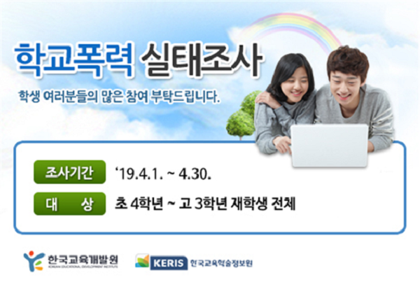 이번 실태조사는 학교와 교육청이 학교폭력 실태와 인식을 조사해 학교폭력을 예방하고 대응방안을 마련하기 위해 계획됐다. 경기도교육청에 따르면 `2019년 1차 학교폭력 실태조사`는 전국시도교육감협의회 주관으로 한국교육개발원에 위탁해 전국에서 동시에 진행한다. 학생은 학교폭력실태조사 사이트, NEIS 대국민 서비스와 학교 홈페이지를 통해 온라인으로 참여가 가능하다.