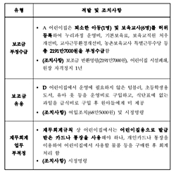 `보육료 부당청구 및 유용`으로 적발된 7건(200만 원)은 초등학생용 도서 구입 등 운영비 사용에 대한 이해가 부족해 발생한 것으로 판단되는 비교적 경미한 사항이었다.