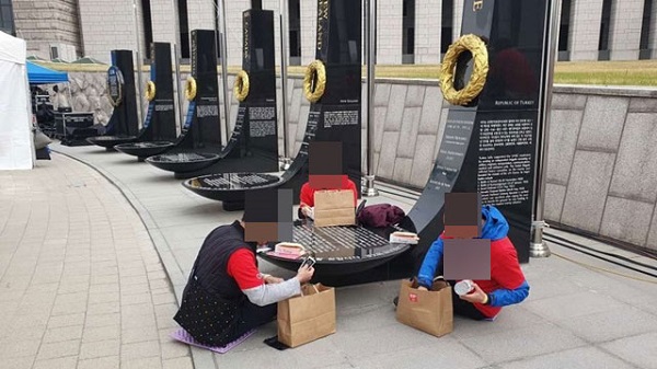 [아유경제=장성경 기자] 서울 용산 전쟁기념관에서 일부 방문객들이 평화의 광장 위령비를 `밥상`으로 사용한 사실이 알려졌다.