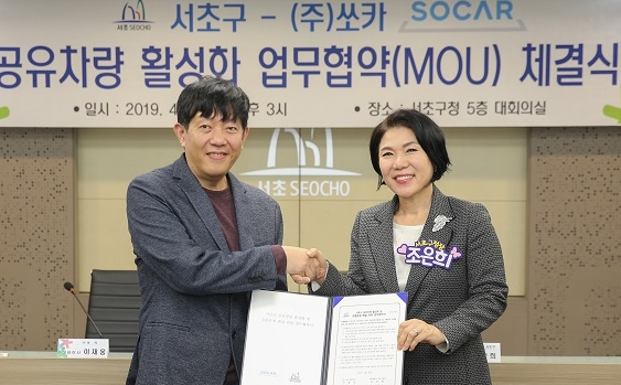 [아유경제=정현호 기자] 서울 서초구(청장 조은희)는 거주자우선주차장 등을 활용한 차량공유사업 구축을 위해 쏘카(대표 이재웅)와 공유차 활성화 업무협약(MOU)을 지난 4월 30일 체결했다.
