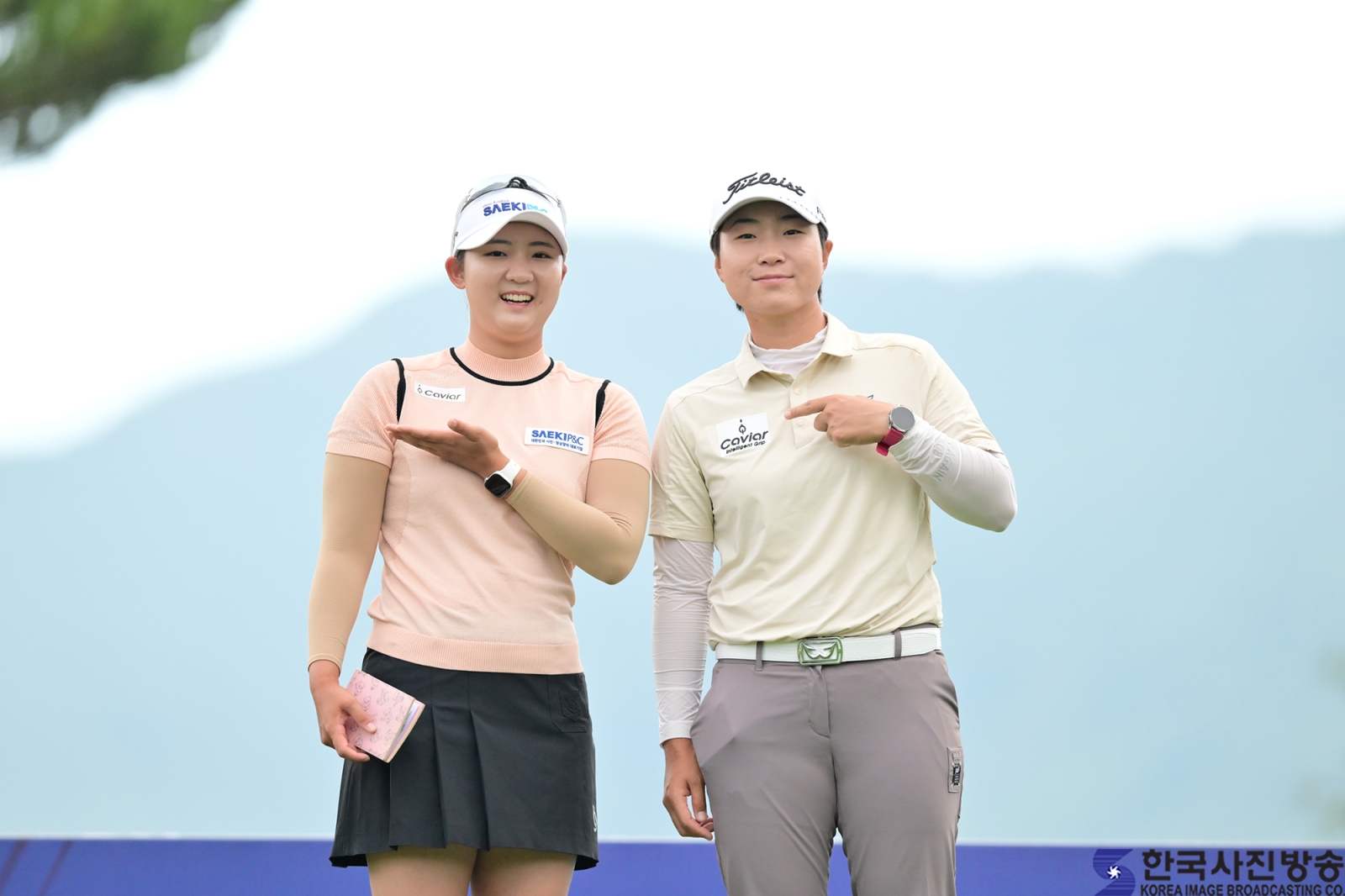 황유나, 김지수 프로가 가숨에 같은 패치를 붙이고 경기에 나와 카메라에 포즈를 취하고 있다.