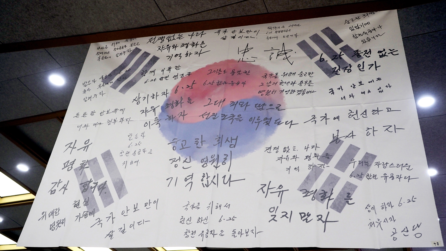 ▲ 행사장 좌우편에는 태극기 위에 참전유공자들이 직접 적은 글귀들 전시택극기에 써있는 글귀를 보는 내빈들
