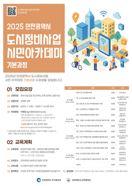 [아유경제=조명의 기자] 인천광역시는 오는 8월 11일부터 9월 19일까지 `2025년 인천 도시정비사업 시민 아카데미`를 운영한다고 밝혔다.