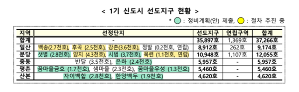 지난해 11월 선정된 1기 신도시 선도지구 총 15개 구역은 정부ㆍ지자체의 지원 하에 차질 없이 추진 중이다. 현재 7개 구역이 정비계획(안)을 제출해 특별정비구역 지정을 위한 사전검토를 받고 있으며, 나머지 8개 구역 중 5개 구역도 사업 방식 확정 후 정비계획(안)을 마련 중이다. 3개 구역은 주민대표단 선정ㆍ사업 방식 결정 등 절차를 밟고 있다.