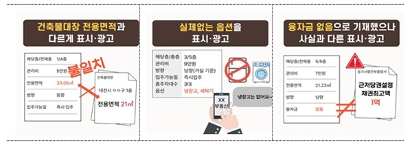 부당한 표시ㆍ광고는 전용면적을 실제보다 크게 표시ㆍ광고한 경우, 실제없는 옵션(냉장고 등)을 표시ㆍ광고한 경우, 융자금이 없다고 표시ㆍ광고했으나 근저당권이 있는 경우, 이미 계약이 체결됐음에도 표시ㆍ광고 삭제를 지연하는 경우 등 왜곡된 정보를 표시한 경우 등에 해당한다.