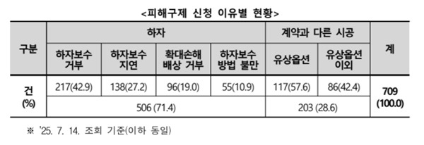 신청 이유로는 `하자` 관련이 71.4%(506건)로 다수를 차지했고, `계약과 다르게 시공한 경우`가 28.6%(203건)였다.